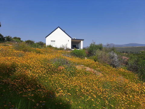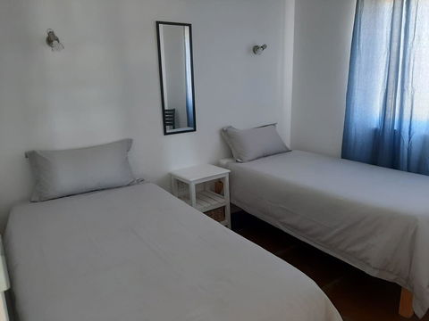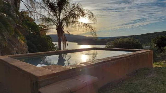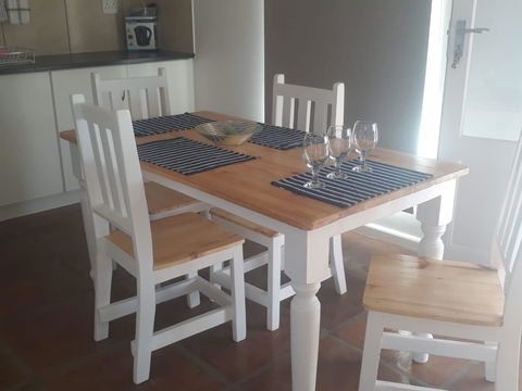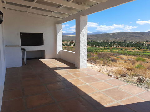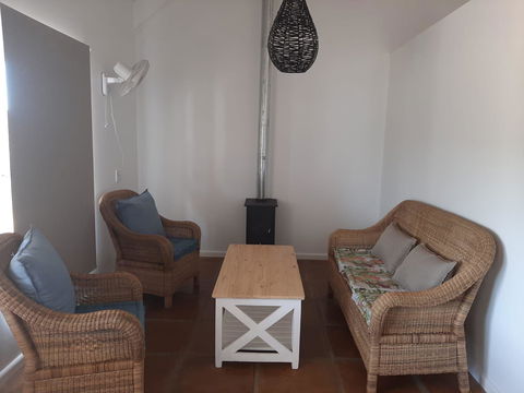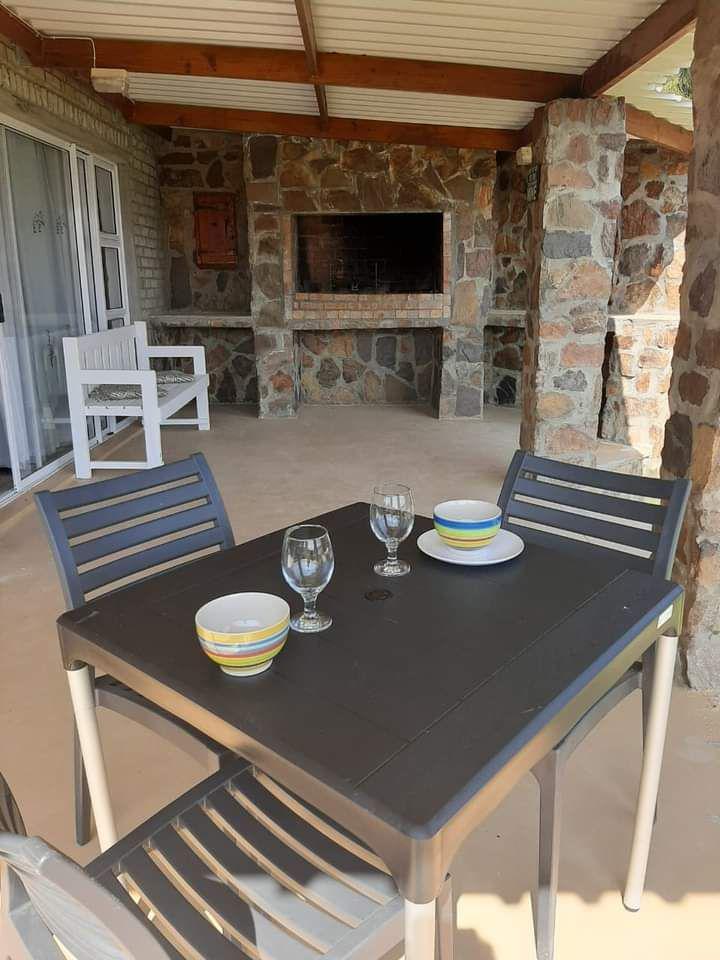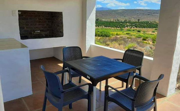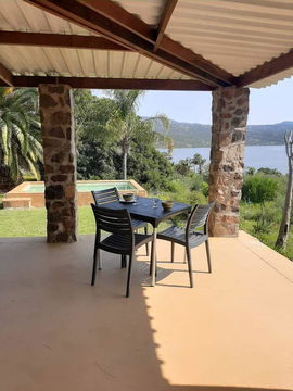 This 2 bedroom ( one double bed and one with twin beds) has a bathroom with a shower, kitchen with fridge, microwave, mini oven, toaster, kettle crockery and cutlery. The house has a aircon as well as ceiling fans. The braai is on the covered stoep. These 2 units on the hill have great views.